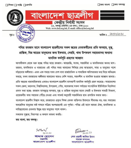 পবিত্র রমজান মাসে বাংলাদেশ ছাত্রলীগের সকল স্তরের নেতাকর্মীদের প্রতি অসহায়, দুস্থ, প্রান্তিক, নিম্ন আয়ের মানুষদের জন্য ইফতার, সেহরি, খাদ্য উপকরণ সহায়তাসহ অন্যান্য মানবিক কর্মসূচি গ্রহণের আহ্বান