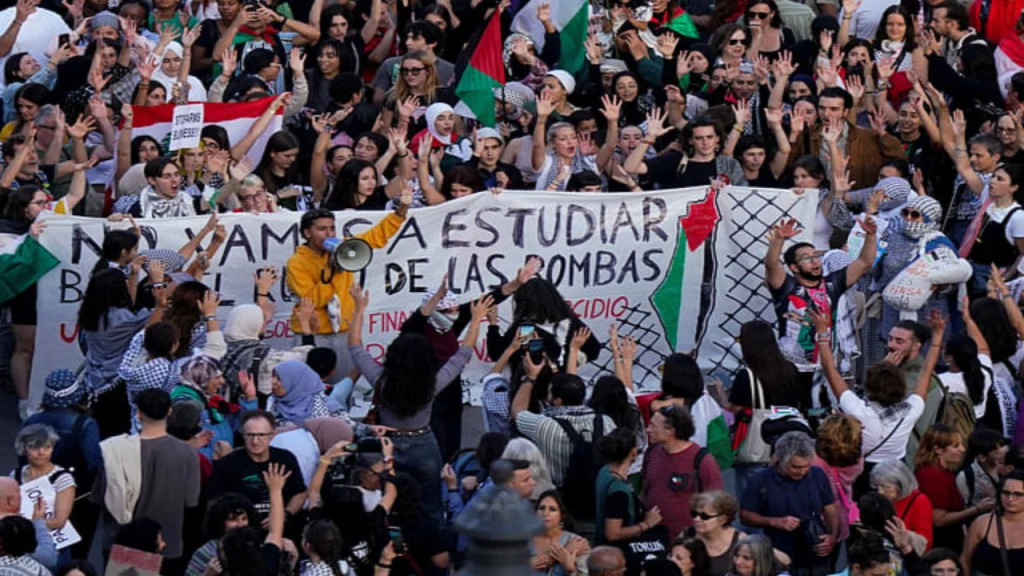 দেওয়ায় সংঘাতটি একটি বিস্তৃত যুদ্ধে পরিণত হতে পারে বলে আশঙ্কা করা হচ্ছে। রোমে একটি ফিলিস্তিনিপন্থি বিক্ষোভে তরুণ বিক্ষোভকারী পুলিশকে বোতল ও আতশবাজি ছুড়লে পুলিশ টিয়ার গ্যাস ও জল কামান দিয়ে হাজার হাজার মানুষকে ছত্রভঙ্গ করে দেয়। এএফপির সাংবাদিকরা জানান, বিক্ষোভে অন্তত একজন পুলিশ সদস্য আহত হয়েছে এবং দুই বিক্ষোভকারীকে আটক করা হয়েছে। বার্লিনের পুলিশ বলেছে, তারা ২৬ জনকে আটক করেছে। সেখানে ৬৫০ জন লোকের উপস্থিতিতে ইসরায়েলপন্থি একটি স্মৃতিচারণের বিরুদ্ধে প্রতিবাদ জানানো হয়। এদিকে, জার্মানির পুলিশ জানায়, রাজধানীতে ফিলিস্তিনপন্থি এক বিক্ষোভে সহস্রাধিক মানুষ জমায়েত হয়। লন্ডনে ‘ন্যাশনাল মার্চ ফর প্যালেস্টাইন’ এ ‘বেসামরিক নাগরিকদের ওপর বোমা হামলা বন্ধ করো’ স্লোগানে আকাশ বাতাস প্রকম্পিত হয়ে ওঠে। লন্ডনের