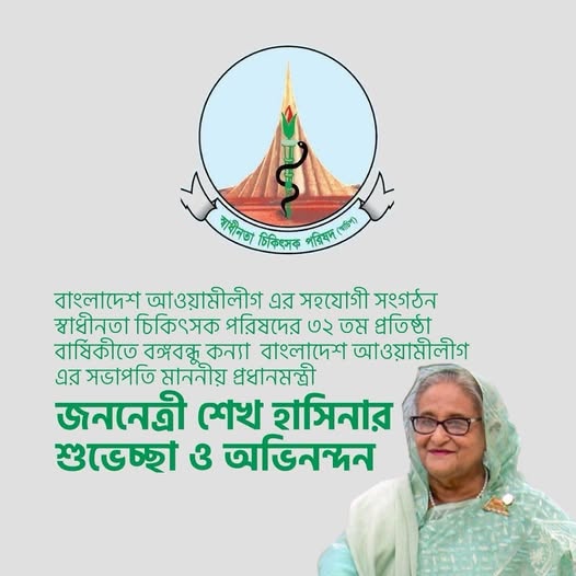 বাংলাদেশ আওয়ামীলীগ এর সহযোগী সংগঠন স্বাধীনতা চিকিৎসক পরিষদের (স্বাচিপ) ৩২ তম প্রতিষ্ঠাবার্ষিকী উপলক্ষে বঙ্গবন্ধু কন্যা বাংলাদেশ আওয়ামীলীগ এর সভাপতি জননেত্রী শেখ হাসিনার অভিনন্দন ও শুভেচ্ছা বার্তা