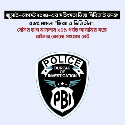 জুলাই–আগস্ট ২০২৪-এর সহিংসতা নিয়ে পিবিআই তদন্ত: ৫৬% মামলা “মিথ্যা ও ভিত্তিহীন”, বেশির ভাগ মামলায় ৯০% পর্যন্ত আসামির সঙ্গে ঘটনার কোনো সংযোগ নেই