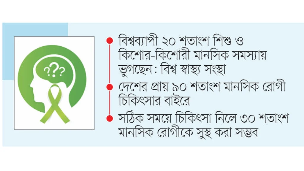 কর্মদিবস নষ্ট হয়। অন্যদিকে পরিসংখ্যান ব্যুরোর (বিবিএস) জনশুমারি ও গৃহগণনার প্রতিবেদন অনুযায়ী, দেশের মোট জনগোষ্ঠীর প্রায় ৬২ শতাংশ কর্মক্ষম, যাদের বয়স ১৫ থেকে ৫৯ বছরের মধ্যে। সংখ্যায় যা ১০ কোটি ৫০ লাখ। সে হিসেবে প্রায় এক কোটি ৯০ লাখের বেশি মানুষ মানসিক সমস্যায় ভুগছে। এমন প্রেক্ষাপটে আজ বৃহস্পতিবার পালিত হচ্ছে বিশ্ব মানসিক স্বাস্থ্য দিবস। এ বছর দিবসটির প্রতিপাদ্য ‘কর্মস্থলে মানসিক স্বাস্থ্যকে অগ্রাধিকার দেয়ার এখনই সময়’। দিবসটি উপলক্ষে সরকারি-বেসরকারি বিভিন্ন কর্মসূচি নেওয়া করেছে। বিশ্বব্যাপী মানসিক রোগ সম্পর্কে ভ্রান্ত ধারণা, কুসংস্কার দূর এবং জনসচেতনতা সৃষ্টিতে ওয়ার্ল্ড ফেডারেশন ফর মেন্টাল হেলথ ১৯৯২ সাল থেকে ১০ অক্টোবর বিশ্ব মানসিক স্বাস্থ্য দিবস পালন শুরু করে। দিবসটি