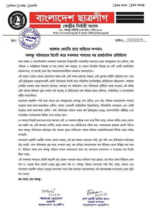 ক্যাঙ্গারু কোর্টের রায়ে আইনের অপমান: বঙ্গবন্ধু পরিবারকে টার্গেট করে দখলদার শাসনের নগ্ন রাজনৈতিক প্রতিহিংসা