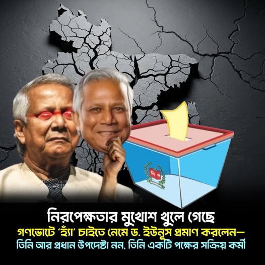 নিরপেক্ষতার মুখোশ খুলে গেছে গণভোটে ‘হ্যাঁ’ চাইতে নেমে ড. ইউনূস প্রমাণ করলেন—তিনি আর প্রধান উপদেষ্টা নন, তিনি একটি পক্ষের সক্রিয় কর্মী