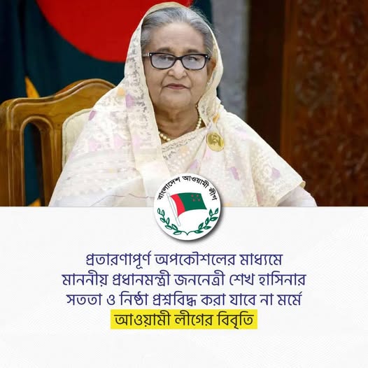 প্রতারণাপূর্ণ অপকৌশলের মাধ্যমে মাননীয় প্রধানমন্ত্রী জননেত্রী শেখ হাসিনার সততা ও নিষ্ঠা প্রশ্নবিদ্ধ করা যাবে না মর্মে আওয়ামী লীগের বিবৃতি