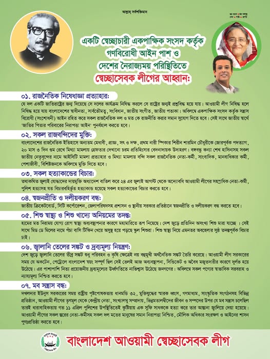 একটি স্বেচ্ছাচারী একপাক্ষিক সংসদ কর্তৃক গণবিরোধী আইন পাশ ও দেশের নৈরাজ্যময় পরিস্থিতিতে স্বেচ্ছাসেবক লীগের আহ্বানঃ