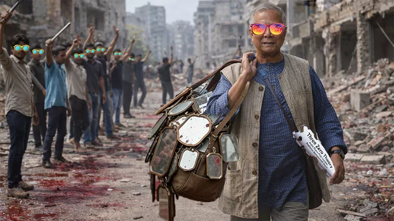 অন্ধের দেশে আয়না বিক্রি করতে আসা ফেরিওয়ালা ও তার রঙিন চশমার খদ্দেরেরা