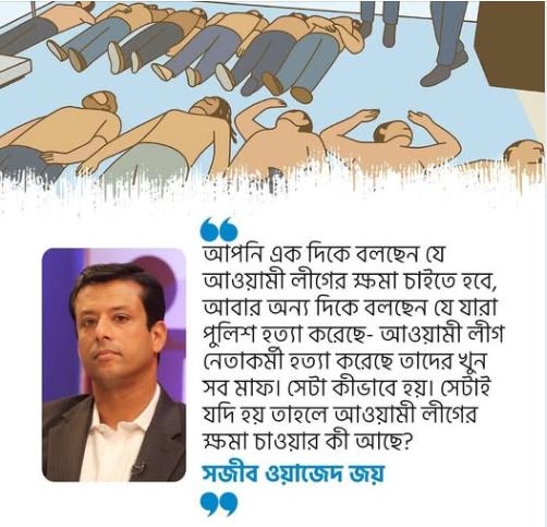 আওয়ামী লীগ নেতাকর্মী হত্যা করেছে তাদের খুন সব মাফ সেটাই যদি হয় তাহলে আওয়ামী লীগের ক্ষমা চাওয়ার কী আছে? – সজীব ওয়াজেদ জয়