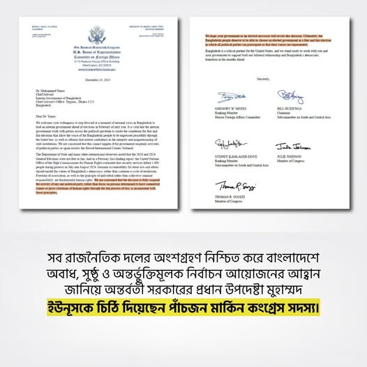 সব দলের অংশগ্রহণ নিশ্চিত করে বাংলাদেশে অবাধ, সুষ্ঠু ও অন্তর্ভুক্তিমূলক নির্বাচন আয়োজনের আহ্বান জানিয়ে মার্কিন কংগ্রেস
