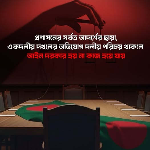 প্রশাসনের সর্বত্র আদর্শের ছায়া,একদলীয় দখলের অভিযোগ দলীয় পরিচয় থাকলে আইন দরকার হয় না কাজ হয়ে যায়