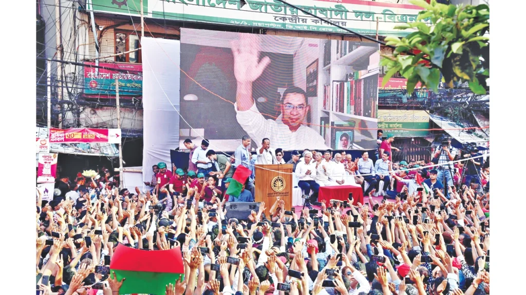 আদায়ের মিছিল, নিজের অধিকার রক্ষা ও অধিকার প্রতিষ্ঠার মিছিল। মানুষের ভোটের অধিকার নিশ্চিত করার পক্ষে অবস্থান তুলে ধরে তারেক রহমান বলেন, স্বৈরাচার বা ফ্যাসিবাদমুক্ত পরিবেশেও স্বল্প আয়ের মানুষদের বাজার সিন্ডিকেটের অভিশাপ থেকে মুক্ত করা অসম্ভব হয়ে পড়বে, যদি না আমরা মানুষের সরাসরি ভোটের অধিকার নিশ্চিত করতে পারি। তিনি আরও বলেন, বাংলাদেশে আর কখনো যেন ফ্যাসিবাদ স্বৈরাচার ফিরে আসতে না পারে, সেজন্য প্রতিটি নাগরিকের সরাসরি ভোট দিয়ে জনপ্রতিনিধি নির্বাচনের সক্ষমতা অর্জন জরুরি। স্থানীয় সরকার থেকে কেন্দ্র পর্যন্ত নির্বাচিত হতে ইচ্ছুক জনপ্রতিনিধিদের জনগণের ভোটের প্রতি মুখাপেক্ষী না করা পর্যন্ত জনগণ গণতন্ত্রের সুফল পাবে না। ছাত্র-জনতার বিপ্লবে ফ্যাসিবাদের পতন হওয়ায় জনগণকে অভিনন্দনও জানান বিএনপির ভারপ্রাপ্ত
