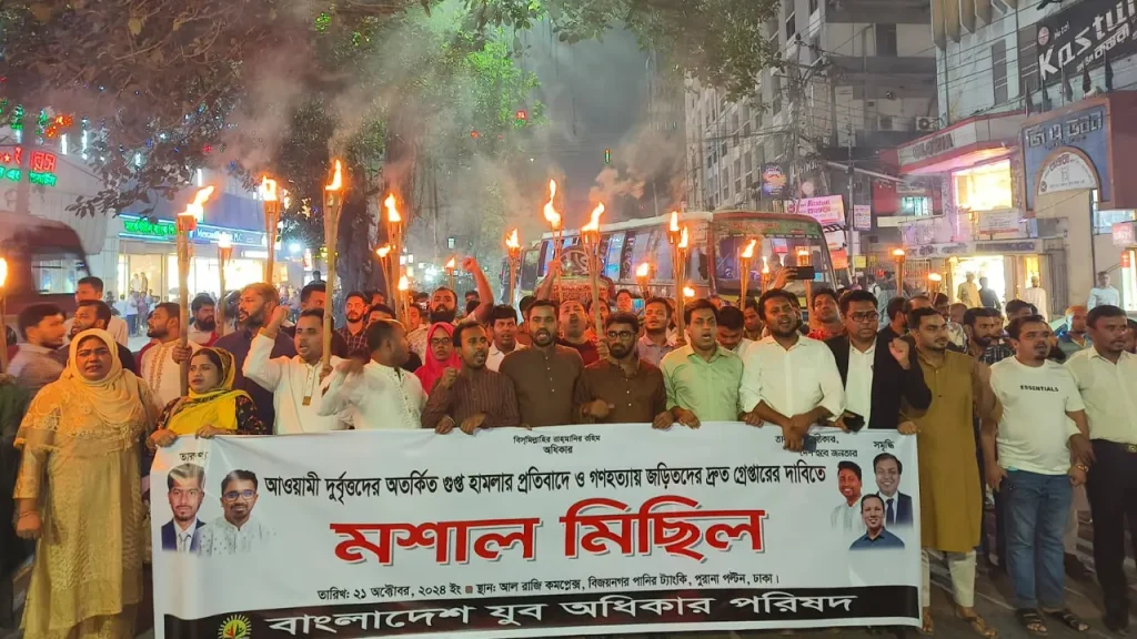 পুরানা পল্টন মোড় সংলগ্ন আল রাজী কমপ্লেক্সের সামনে থেকে মশাল মিছিল শুরু করে পল্টন মোড়, বিজয়নগর পানির ট্যাংকি মোড় ঘুরে আল রাজী কমপ্লেক্সের সামনে সংক্ষিপ্ত সমাবেশের মাধ্যমে শেষ হয়। আওয়ামী দুর্বৃত্তদের অতর্কিত গুপ্ত হামলার প্রতিবাদ এবং গণহত্যায় জড়িতদের দ্রুত গ্রেপ্তারের দাবিতে এই কর্মসূচি পালিত হয়।