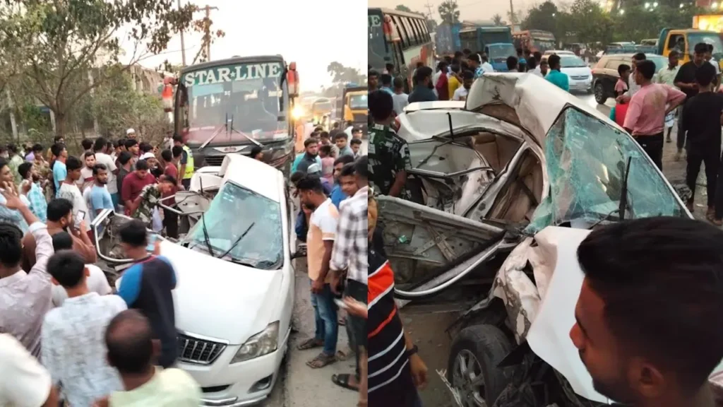 পুলিশ ও স্থানীয় সূত্রে জানা যায়, স্টারলাইন পরিবহনের একটি দ্রুতগামী বাস একটি প্রাইভেটকারকে সজোরে ধাক্কা দিলে গাড়িটি দুমড়ে-মুচড়ে যায়। প্রাইভেটকারটিতে চালকসহ মোট ৬ জন ছিলেন।