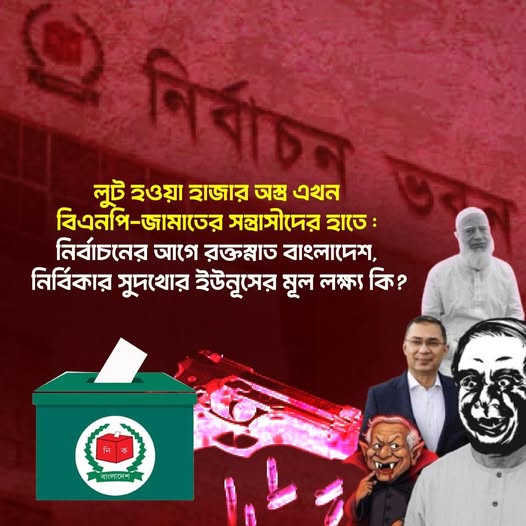 লুট হওয়া হাজার অস্ত্র এখন বিএনপি-জামাতের সন্ত্রাসীদের হাতে : নির্বাচনের আগে রক্তস্নাত বাংলাদেশ, নির্বিকার সুদখোর ইউনূসের মূল লক্ষ্য কি?