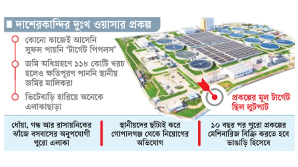 ২০১৫ সালে রাজধানীর ৫০ লাখ মানুষকে পয়ঃসেবা দেওয়ার লক্ষ্য নিয়ে প্রায় ৩ হাজার ৩০০ কোটি টাকা ব্যয়ে একটি প্রকল্প নেয় ঢাকা ওয়াসা। পরবর্তী সময়ে প্রকল্প ব্যয় বাড়িয়ে সেটি দাঁড়ায় প্রায় ৩ হাজার ৮০০ কোটি টাকায়। ২০২২ সালের জুন মাসে প্রকল্পের কাজ শেষও হয়। ঘটা করে সাবেক প্রধানমন্ত্রী শেখ হাসিনা সেটি উদ্বোধন করেন। সেই প্রকল্পের কোনো সুফল পাওয়া যায়নি। অপরিকল্পিত প্রকল্পে সরকারের প্রায় ৪ হাজার কোটি টাকা খরচ হওয়ার পর ট্রিটমেন্ট প্লান্টটি চালিয়ে রাখতে প্রতি বছর সরকারকে এখন গচ্চা দিতে হচ্ছে প্রায় ৫০০ কোটি টাকা। এত টাকা গচ্চা দিয়েও সক্ষমতা অনুযায়ী বর্জ্যের অভাবে প্লান্টের সব যন্ত্রপাতি চালু রাখা সম্ভব হচ্ছে না।