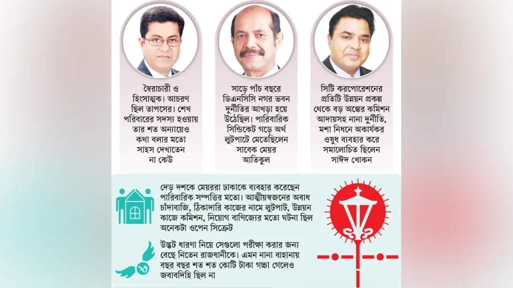 অন্তত কয়েক হাজার কোটি টাকা। তবে এসব প্রকল্প থেকে মেয়র এবং তাদের স্বজন হাতিয়ে নিয়েছেন বিপুল পরিমাণ অর্থ। গত দেড় দশকে রাজধানী বসবাসের অযোগ্য শহরের তালিকায় ওপরের দিকে উঠলেও ভাগ্য বদলেছে দায়িত্ব পালন করা মেয়র এবং তাদের স্বজনের। শেখ ফজলে নূর তাপস: ২০২০ সালে ঢাকা দক্ষিণ সিটি করপোরেশনের (ডিএসসিসি) মেয়র পদে দায়িত্ব নিয়ে দুর্নীতির বিরুদ্ধে জিরো টলারেন্সের ঘোষণা দেন ব্যারিস্টার শেখ ফজলে নূর তাপস। এরপর সংস্থাটির অতিরিক্ত প্রধান প্রকৌশলী আসাদুজ্জামান ও প্রধান রাজস্ব কর্মকর্তা ইউসুফ আলী সরদারকে দুর্নীতির দায়ে চাকরিচ্যুত করেন। নিজের আধিপত্য বিস্তারে অসংখ্য কর্মকর্তা-কর্মচারীকে দুর্নীতির দায়ে চাকরিচ্যুত করেন তিনি। মেয়র থাকাকালে তার স্বৈরাচারী শাসন, শোষণ, অপকর্ম ও দুর্নীতি নিয়ে