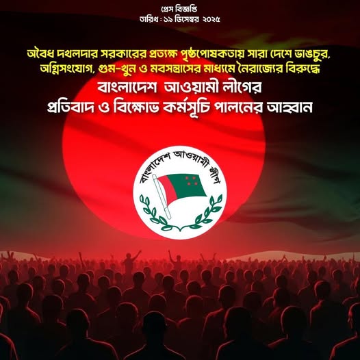 অবৈধ দখলদার সরকারের প্রত্যক্ষ পৃষ্ঠপোষকতায় সারা দেশে ভাঙচুর, অগ্নিসংযোগ, গুম-খুন ও মবসন্ত্রাসের মাধ্যমে নৈরাজ্যের বিরুদ্ধে বাংলাদেশ আওয়ামী লীগের প্রতিবাদ ও বিক্ষোভ কর্মসূচি
