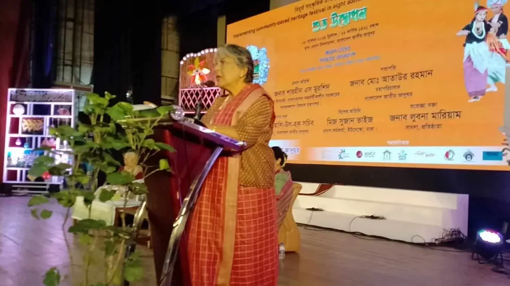 সমাজকল্যাণ এবং মহিলা ও শিশু বিষয়ক মন্ত্রণালয়ের উপদেষ্টা শারমীন এস মুরশিদ বলেছেন, বাংলাদেশের ইতিহাস ও ঐতিহ্য সমৃদ্ধ একটি দেশ। এ অঞ্চলের সাংস্কৃতিক ইতিহাস বহু বছর ধরে লালিত হয়ে আসছে, নিজস্ব বৈশিষ্ট্যের কারণে এদেশের ঐতিহ্য স্বমহিমায় উজ্জ্বল হয়ে রয়েছে। আমাদের সমৃদ্ধ সংস্কৃতি তরুণ প্রজন্মের মাধ্যমে বিশ্ব দরবারে পরিচয় তুলে ধরতে চাই। শুক্রবার (৮ নভেম্বর) বাংলাদেশ জাতীয় জাদুঘরে বিমূর্ত সাংস্কৃতিক ঐতিহ্যের সুরক্ষায় ইউনেস্কো কর্তৃক অনুমোদিত ইমপ্লিমেন্টিং কমিউনিটি বেইসড হেরিটেজ ফেস্টিভাল ইন এই অ্যাডমিনিস্ট্রেটিভ ডিভিশন ইন বাংলাদেশ শীর্ষক প্রকল্পের উদ্বোধনী অনুষ্ঠানে প্রধান অতিথির বক্তৃতায় এসব কথা বলেন তিনি। অনুষ্ঠানে বাংলাদেশ জাতীয় জাদুঘরের মহাপরিচালক মো. আতাউর রহমানের সভাপতিত্বে বিশেষ অতিথির বক্তব্য দেন ইউনেস্কো ঢাকা অফিসের প্রধান