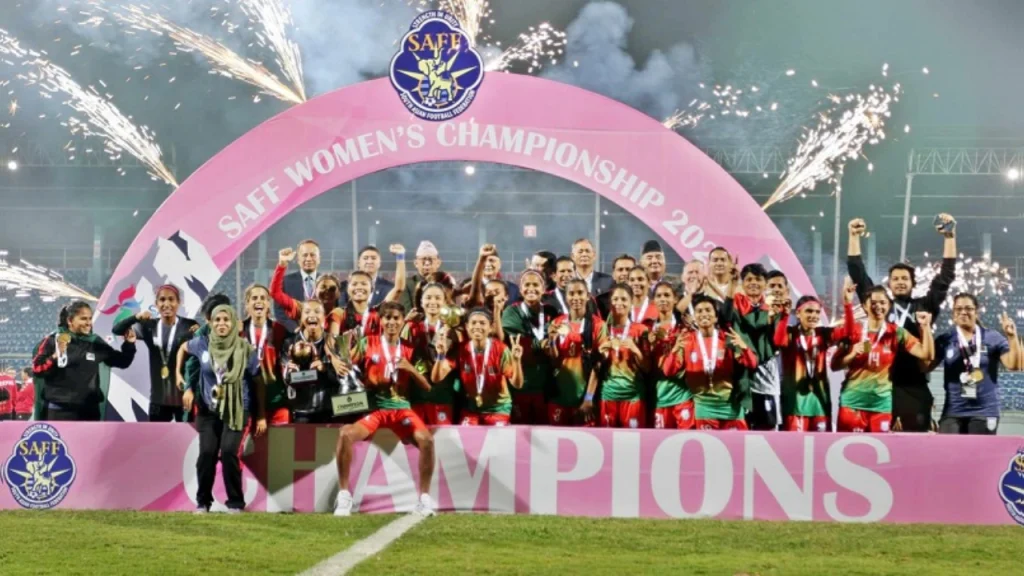 গর্জে ওঠে। সমতা ফেরানোর পরও দুই দলই গোলের জন্য মরিয়া হয়ে ওঠে। ৬৭ মিনিটে বাংলাদেশ অধিনায়ক মারিয়া মান্দার শট নেপাল গোলরক্ষক রুখে দেন। অন্যদিকে নেপালও দুইবার প্রতি-আক্রমণে গিয়ে ব্যর্থ হয়। শেষ পর্যন্ত ৮২ মিনিটে বাঁ প্রান্ত থেকে মাসুরার থ্রো-ইন থেকে বল পান ঋতুপর্ণা চাকমা। বক্সের বাইরে থেকে নেওয়া তার জোরালো শটে নেপালের গোলরক্ষক বল ছুঁলেও জালে প্রবেশ করে। এই গোলে ২-১ ব্যবধানে লিড নেয় বাংলাদেশ। এরপর নেপাল আর কোনো গোল করতে না পারলে বাংলাদেশের জয় নিশ্চিত হয়। একই ভেন্যুতে ২০২২ সালে ৩-১ ব্যবধানে নেপালকে হারিয়ে প্রথমবারের মতো সাফ শিরোপা জিতেছিল বাংলাদেশ। এবারও সেই নেপালকে হারিয়ে একই ট্রফি ধরে রাখল দলটি, যা দক্ষিণ এশিয়ায়