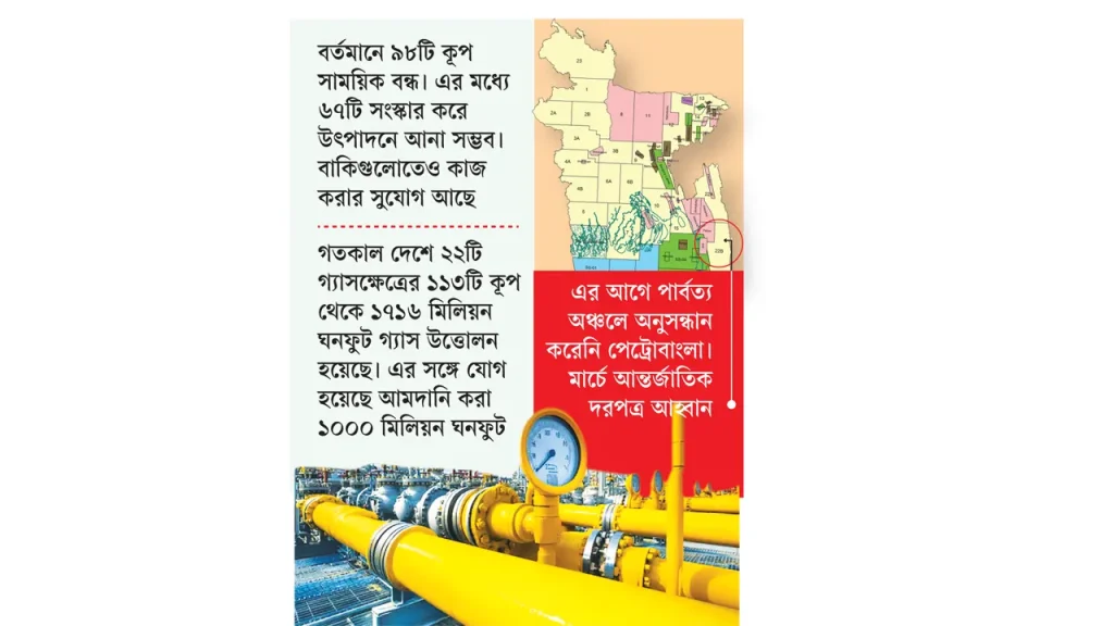ক্রমেই ফুরিয়ে আসছে। এ অবস্থায় স্থালভাগে গ্যাস অনুসন্ধানের ওপর জোর দেয়ার পাশাপাশি পরিত্যক্ত গ্যাসকূপগুলোকে ফের খনন ও সংস্কারের মাধ্যমে গ্যাস উত্তোলনের পরিকল্পনা বাস্তবায়নে কাজ শুরু করেছে পেট্রোবাংলা। বিভিন্ন গ্যাসক্ষেত্রের ৯৮টি কূপ সাময়িক বন্ধ ও পরিত্যক্ত অবস্থায় রয়েছে। এর মধ্যে ৬৭টি সংস্কারের মাধ্যমে উৎপাদনে আনা সম্ভব। বাকিগুলোতেও কাজ করার সুযোগ আছে বলে সংশ্লিষ্টরা জানান। সংশ্লিষ্ট কর্মকর্তা জানান, সাগরে তেল-গ্যাস অনুসন্ধান সময়সাপেক্ষ ব্যাপার। তার চেয়ে কম সময়ে স্থলভাগের অনুসন্ধান-কাজ সম্পন্ন করা সম্ভব। দ্বিমাত্রিক জরিপের ভিত্তিতে উচ্চ সম্ভাবনাময়, মাঝারি সম্ভাবনাময় ও ন্যূনতম সম্ভাবনাময় এই তিন ক্যাটাগরিতে ব্লকগুলোকে ভাগ করা হচ্ছে। আন্তর্জাতিক দরপত্রে দেশীয় অনুসন্ধান কোম্পানিগুলোকে অংশ নেওয়ার সুযোগ রাখা হচ্ছে। এ ক্ষেত্রে কোম্পানিগুলোর টেকনিক্যাল,