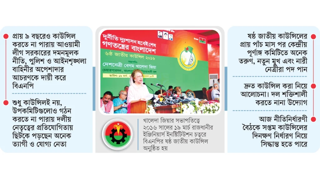 পরিস্থিতিতে কাউন্সিলের কোনো দৃশ্যমান উদ্যোগ না থাকলেও বিষয়টি আলোচনায় আছে। কেননা, কাউন্সিল একটি দীর্ঘ প্রক্রিয়ার বিষয়। কয়েক মাস সময় লাগে। এখন সিদ্ধান্ত নিলেও তিন-চার মাস পর কাউন্সিল করতে হবে। বিএনপির নির্বাহী কমিটির অবস্থা ২০১৬ সালের ১৯ মার্চ রাজধানীর ইঞ্জিনিয়ার্স ইনস্টিটিউশন মিলনায়তনে ষষ্ঠ জাতীয় কাউন্সিল করে বিএনপি। সম্মেলনের প্রায় পাঁচ মাস পর ৬ আগস্ট ঘোষিত কেন্দ্রীয় পূর্ণাঙ্গ কমিটিতে অনেক তরুণ, নতুন মুখ এবং নারী নেত্রীরা পদ পান। ছাত্রদলের সাবেক শতাধিক নেতাকেও পূর্ণাঙ্গ কমিটিতে পদ দেওয়া হয়। জাতীয় নির্বাহী কমিটিতে স্থায়ী কমিটির পদ ১৯টি (চেয়ারম্যান, সিনিয়র ভাইস চেয়ারম্যান, মহাসচিবসহ) উপদেষ্টা কাউন্সিলের পদ ৭৩টি, ভাইস চেয়ারম্যান ৩৫টি, যুগ্ম মহাসচিব ৭টি, সম্পাদক ও সহ-সম্পাদক মিলে ৫৯২টি