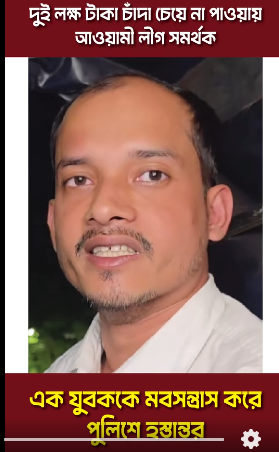 দুই লক্ষ টাকা চাঁদা চেয়ে না পাওয়ায় আওয়ামী লীগ সমর্থক এক যুবককে মবসন্ত্রাস করে পুলিশে হস্তান্তর