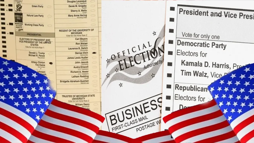 যে কেবল কমলা হ্যারিস এবং ডোনাল্ড ট্রাম্পের জন্য জায়গা থাকে এম নয়। এতে মার্কিন সিনেট ও প্রতিনিধি সভার প্রার্থীর নাম এবং স্থানীয় বিভিন্ন ইনিশিয়েটিভ ও প্রস্তাব দেওয়ার জন্য বিশেষ ঘর বরাদ্দ থাকে। মার্কিণ নির্বাচনে সিল বা আঙ্গুলের ছাপ দিয়ে ভোট দিতে হয় না ভোটারদেন। এর বদলে ভোটাররা গোলাকৃতির ঘর পূরণ করেন। এগুলো টিক বা ক্রস চিহ্ন নয়। পুরো ঘর বৃত্তাকারে পূরণ করতে হয়। এজন্য প্রায় ১০ মিনিটের মতো সময় লাগে। সশরীরে ভোটদানের সুযোগের পাশাপাশি বেশিরভাগ অঙ্গরাজ্যে ডাকযোগেও ভোটের ব্যবস্থা থাকে। এই পদ্ধতিতে ভোটাররা মূলত চিঠির মাধ্যমে পূরণকৃত ব্যালট পেপার পাঠাতে পারেন অথবা কোনো সুনির্দিষ্ট ড্রপ-অফ স্থানে তা জমা দিয়ে যেতে পারেন। প্রতিটি অঙ্গরাজ্য
