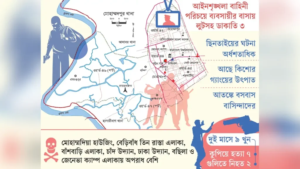 আতঙ্কিত করে তুলেছে পুরো নগরবাসীকে। দ্রুত পরিস্থিতি নিয়ন্ত্রণে আশ্বাস দিচ্ছেন আইনশৃঙ্খলা রক্ষাকারী বাহিনীর সদস্যরা, যদিও স্থানীয় বাসিন্দারা প্রশ্ন তুলেছেন তাদের আন্তরিকতা নিয়েই। দুই মাসে ৯ খুন, চুরি-ডাকাতি দিনদুপুরেই: মোহাম্মদপুর এলাকায় গত আড়াই মাসে ঘটে যাওয়া অপরাধকাণ্ড বিশ্লেষণ করে দেখা গেছে, এই সময়ে ওই এলাকায় হত্যাকাণ্ড ঘটেছে ৯টি। এর মধ্যে সাতজনকে কুপিয়ে এবং দুজনকে গুলি করে হত্যা করা হয়। নিহতদের মধ্যে ছিনতাইকারীদের হাতে একজন, মাদক কারবার নিয়ে দ্বন্দ্বে পাঁচজন এবং আধিপত্য বিস্তারের রেষারেষিতে দুগ্রুপের দ্বন্দ্বে প্রাণ গেছে বাকি তিনজনের। তবে সবচেয়ে বেশি আতঙ্ক ছড়িয়েছে দিনদুপুরে চুরি-ছিনতাই ও ডাকাতির ঘটনা। আড়াই মাসে অন্তত অর্ধশত ছিনতাইয়ের ঘটনা ঘটেছে মোহাম্মদপুরে। এর মধ্যে গত ১১ অক্টোবর রাত