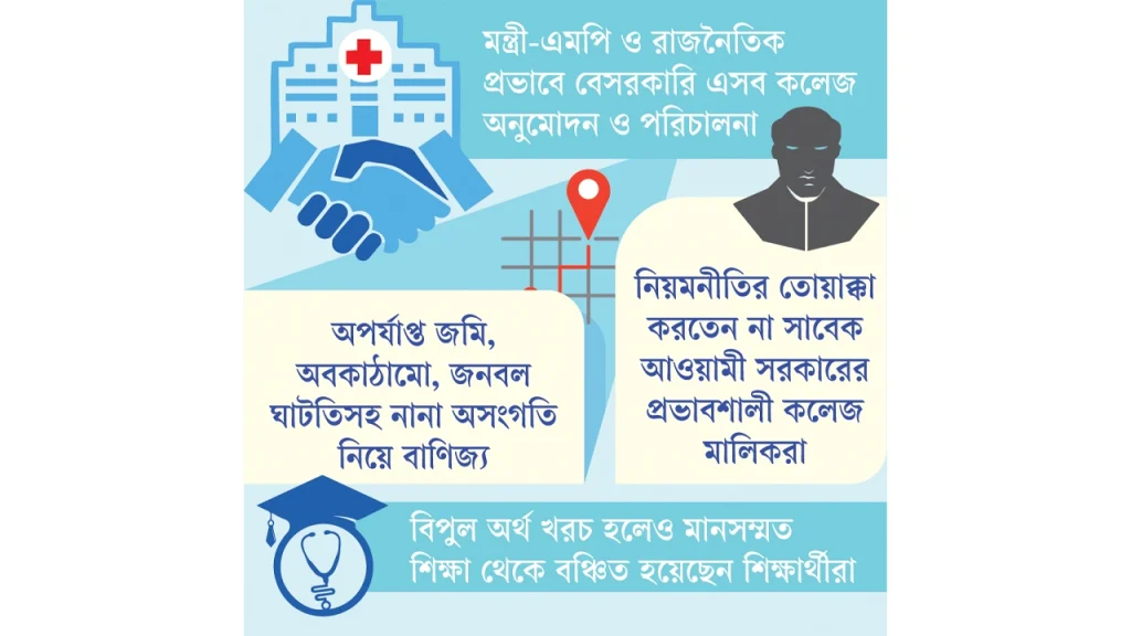 বেসরকারি চিকিৎসা শিক্ষা খাত গত ১৫ বছর রাজনৈতিক ও বাণিজ্যিক উদ্দেশ্যে পরিচালিত হয়েছে। মেডিকেল কলেজ অনুমোদন ও পরিচালনায় সংশ্লিষ্টদের অধিকাংশই মন্ত্রী, সংসদ সদস্য ও আওয়ামীপন্থি রাজনৈতিক দলের প্রভাবশালী। এতে অভিভাবকদের বিপুল অর্থ প্রভাবশালীদের পকেটে গেলেও মানসম্মত শিক্ষা থেকে বঞ্চিত হয়েছেন শিক্ষার্থীরা।