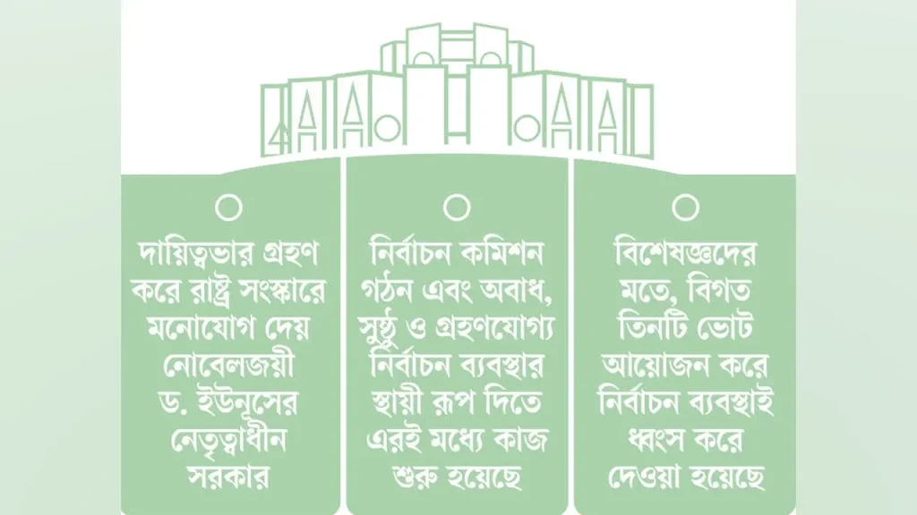ঘোষণার দাবি জানিয়েছে। ভিন্ন প্রেক্ষাপটে তারাও চাইছে কাঙ্ক্ষিত নির্বাচন। সে লক্ষ্যে ভেতরে ভেতরে নির্বাচনের প্রস্তুতিও সেরে নিচ্ছে দলগুলো। দেশের সাধারণ মানুষও মেতে উঠতে চায় নির্বাচন উপলক্ষে। সবারই টার্গেট জাতীয় নির্বাচন। নির্বাচন বিশেষজ্ঞদের মতে, দলীয় সরকারের অধীনে বিগত তিনটি ভোট আয়োজন করে পুরো নির্বাচন ব্যবস্থাই ধ্বংস করে দেওয়া হয়েছে। নিজেদের ভোটাধিকার থেকে বঞ্চিত হয়েছেন নাগরিকরা। এসব নির্বাচন নিয়ে দেশ-বিদেশে সবসময়ই বিতর্ক ছিল তুঙ্গে। কখনো একতরফা, কখনো রাতের ভোট এবং কখনো ডামি ভোটের মাধ্যমে নিজেদের ক্ষমতা নবায়ন করে নিয়েছে ক্ষমতাসীন দল। এ কাজে সহযোগী হিসেবে পাশে ছিল নির্বাচন কমিশন, প্রশাসন ও কোনো কোনো রাজনৈতিক দল। ফলে সরকার পতনের পর নির্বাচন ব্যবস্থাকে নতুন করে