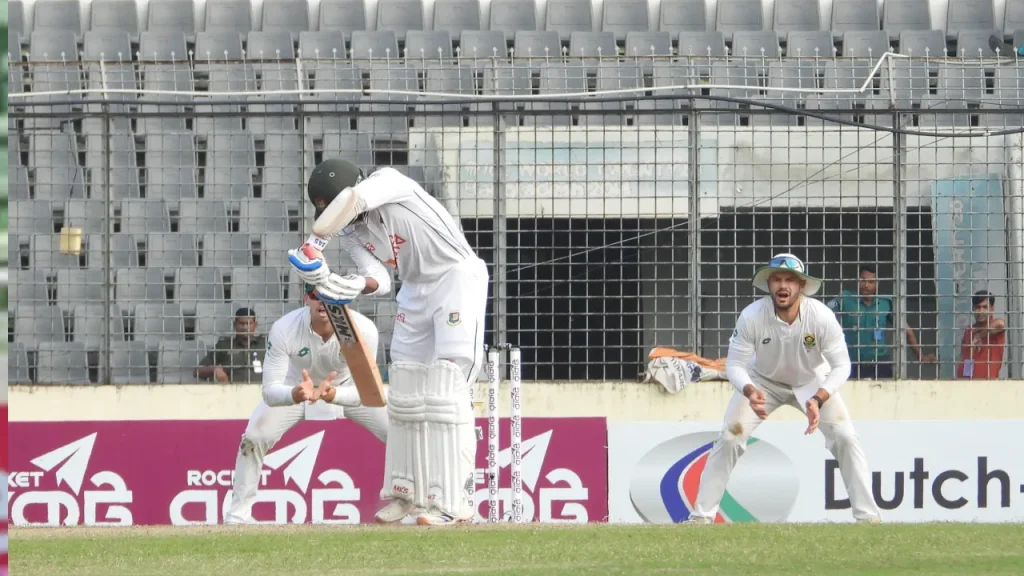 করে দক্ষিণ আফ্রিকা ৩০৮ রান সংগ্রহ করে। তাদের এ বিশাল সংগ্রহের ফলে সফরকারীরা ম্যাচে দৃঢ়ভাবে নিজেদের অবস্থান তৈরি করে। বাংলাদেশের দ্বিতীয় ইনিংসে ব্যাট করতে নামার পর শুরুতেই তারা বড় ধাক্কা খায়। ওপেনার সাদমান ইসলাম ১ রানে কাগিসো রাবাদার বলে আউট হন। এরপর মুমিনুল হকও ০ রান করে রাবাদার বলে প্যাভিলিয়নের পথে হাঁটেন। ফলে বাংলাদেশ মাত্র ৪ রানে ২ উইকেট হারিয়ে চাপে পড়ে যায়। এই বিপর্যয়ের মাঝেও মাহমুদুল হাসান জয় ও নাজমুল হোসেন শান্ত কিছুটা স্থিতিশীলতা এনে দেন। দুই ব্যাটার ধীরে ধীরে ইনিংস গড়ে তোলার চেষ্টা করেন। তবে শান্ত ২৩ রান করে কেশব মহারাজের বলে এলবিডব্লিউ হয়ে যান, যা দলের জন্য আরেকটি ধাক্কা