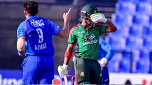 ‘‘শেষ ভালো যার, সব ভালো তার’’। বাক্যটি প্রবাদেই রয়ে গেলো। বাস্তবে করে দেখাতে পারেননি টাইগাররা। ইনিংসের শুরু এবং শেষ কোনোটাই ভালো হয়নি বাংলাদেশ ক্রিকেট দলের। আফগানিস্তানের মতো এশিয়ার উঠতি দলের সঙ্গেও চ্যালেঞ্জিং স্কোর গড়তে পারেননি মেহেদি হাসান মিরাজের নেতৃত্বাধীন দল। ইনিংসের শুরু এবং শেষের দিকে চরম ব্যাটিং বিপর্যয়ের কারণে তিনশ ছুঁইছুঁই স্কোর গড়ার সুযোগ থাকলেও তা আর হয়নি। ইনিংসের শুরুতে ৫৩ রানে ৩ উইকেট পতনের পর দলের হাল ধরেন অধিনায়ক মেহেদি হাসান মিরাজ ও তাওহীদ হৃদয়। এই জুটিতে চতুর্থ উইকেটে তাড়া ১০১ রানের পার্টনারশিপ গড়েন। একটা পর্যায়ে ৩ উইকেটে বাংলাদেশের সংগ্রহ ছিল ১৫৪ রান। তখন মনে হয়েছিল তিনশোর কাছাকাছি হয়তো হবে। কিন্তু এরপর রশিদ খানের গুগলিতে সব হিসেব-নিকেশ পাল্টে যায়। খেই হারিয়ে ফেলে বাংলাদেশ। শেষ দিকে মাত্র ৬৭ রানে ৭ উইকেট পতনের কারণে ৫০ ওভারও খেলা সম্ভব হয়নি। ৪৮.৫ ওভারে ২২১ রানে অলআউট। বুধবার আরব আমিরাতের আবু ধাবি ক্রিকেট স্টেডিয়ামে তিন ম্যাচের ওয়ানডে সিরিজের প্রথম খেলায় টস জিতে প্রথমে ব্যাটিংয়ের সিদ্ধান্ত নেয় বাংলাদেশ। প্রথমে ব্যাট করতে নেমে ইনিংসের চতুর্থ ওভারে ক্যাচ তুলে দিয়ে ফেরেন তানজিদ হাসান তামিম। দলীয় ২৫ রানে ক্যাচ তুলে দিয়ে ফেরেন সাবেক অধিনায়ক নাজমুল হোসেন শান্ত। ৫৩ রানে তৃতীয় ব্যাটসম্যান হিসেবে আউট হন দুর্দান্ত ফর্মে থাকা ওপেনার সাইফ হাসান। ৫৩ রানে ৩ উইকেট পতনের পর দলের হাল ধরেন তাওহীদ হৃদয় ও মেহেদি হাসান মিরাজ। চতুর্থ উইকেটে তারা গড়েন ১৪২ বলে ১০১ রানের জুটি। ৩৫.১ ওভারে ৩ উইকেটে বাংলাদেশের সংগ্রহ ছিল ১৫৪ রান। এরপর মাত্র ৮১ বলে ৬৭ রান যোগ করতেই বাংলাদেশ হারায় ৭ উইকেট। মেহেদি হাসান মিরাজের সঙ্গে ভুল বোঝাবুঝিতে রানআউট হয়েছেন হৃদয়। ৮৫ বল খেলে এক চার আর ৩টি ছক্কার সাহায্যে ৫৬ রান করে ফেরেন তাওহীদ হৃদয়। এরপর রশিদ খানের গুগলিতে এলবিডব্লিউ হয়ে ফেরেন মেহেদি হাসান মিরাজ, জাকের আলি অনিক ও নুরুল হাসান সোহান। ১০ ওভার তথা ৬০ বলে মাত্র ৩৮ রান খরচ করে মিরাজ, জাকের এবং নূরুল হাসান সোহানকে আউট করে বাংলাদেশের মিডলঅর্ডার ধসিয়ে দেন রশিদ খান। মিরাজ ৮৭ বলে এক চার আর এক ছক্কায় ৬০ রান করলেও ১৬ বলে ১০; আর ১৪ বলে ৭ রানের বেশি করতে পারেননি জাকের আলি অনিক ও নূরুল হাসান সোহান। এরপর আর কোনো স্বীকৃত ব্যাটসম্যান না থাকায় শেষ দিকে ৩৪ বলও খেলতে পারেননি পেস বোলার হাসান মাহমুদ, তানজিম হাসান সাকিব ও স্পিনার তানভির ইসলাম। শেষ দিকে একের পর এক উইকেট পতনের কারণে ৪৮.৫ ওভারে ২২১ রানে অলআউট হয় বাংলাদেশ।