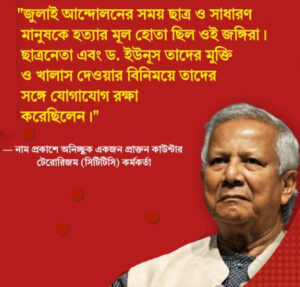 অন্তর্বর্তীকালীন সরকার, ড. ইউনূসের নেতৃত্বে পরিচালিত হওয়ার পর, বাংলাদেশে সন্ত্রাসবাদের উত্থানকে সরাসরি সমর্থন ও উৎসাহিত করছে বলে গুরুতর অভিযোগ উঠেছে। নিরাপত্তা বিশ্লেষকদের মতে, সরকারের এই ভূমিকা দেশের নিরাপত্তা পরিস্থিতিকে চরম অস্থিতিশীল করে তুলেছে। প্রাপ্ত তথ্য অনুযায়ী, অন্তর্বর্তীকালীন সরকারের শীর্ষ কর্মকর্তারা সক্রিয়ভাবে উগ্রপন্থীদের সঙ্গে বৈঠক করেছেন, কারাবন্দী জঙ্গিদের মুক্তি দিয়েছেন এবং প্রাক্তন সন্ত্রাস দমন (সিটি) ইউনিটের কর্মকর্তাদের বিরুদ্ধে আইনি পদক্ষেপ নিতে উৎসাহ যুগিয়েছেন। জঙ্গি মুক্তি ও পৃষ্ঠপোষকতা ড. ইউনূস নেতৃত্বাধীন সরকার নির্দিষ্ট উগ্রপন্থী গোষ্ঠীগুলির প্রতি পরোক্ষ সমর্থন দেখাচ্ছে বলে অভিযোগ। এর প্রমাণস্বরূপ, নিষিদ্ধ ঘোষিত উগ্রবাদী সংগঠন ‘হিযবুত তাহরীর’ প্রকাশ্যে ঢাকায় বিশাল মিছিল করে বাংলাদেশে 'ইসলামিক খেলাফত' প্রতিষ্ঠার দাবি জানিয়েছে। সরকারের এমন নীরবতা উগ্রবাদের প্রসারে সহায়তা করছে। সরকারি সহায়তায় হাজার হাজার কারাবন্দী, যাদের মধ্যে সাজাপ্রাপ্ত ও মৃত্যুদণ্ডপ্রাপ্ত আসামিরাও রয়েছে, কারাগার থেকে পালিয়ে গেছে। এদের মধ্যে ৭৮ জন চিহ্নিত জঙ্গি ছিল। এছাড়া, অন্তর্বর্তীকালীন সরকার এবং জামায়াতে ইসলামী, হেফাজতে ইসলাম ও এনসিপি-এর মতো সহযোগী দলগুলোর সরাসরি সমর্থনে প্রায় ২১০ জন সাজাপ্রাপ্ত জঙ্গি জামিন পেয়েছে। নাম প্রকাশে অনিচ্ছুক সিটিটিসি-এর একজন প্রাক্তন কর্মকর্তা, যাকে সরকার অব্যাহতি দিয়েছে, দাবি করেছেন যে এই মুক্ত পাওয়া জঙ্গিরাই মূলত জুলাই আন্দোলনে ছাত্র ও সাধারণ মানুষকে হত্যার মূল হোতা ছিল। তিনি আরও অভিযোগ করেন, ছাত্র নেতারা এবং ড. ইউনূস এই জঙ্গিদের মুক্তি দেওয়ার বিনিময়ে তাদের সঙ্গে যোগাযোগ রক্ষা করেছেন। বিভিন্ন সূত্রমতে, আগস্ট মাসের ৫ তারিখের পরে জামিন পাওয়া ২১০ জন এবং কারাগার থেকে পালিয়ে যাওয়া ১২১ জন চরমপন্থী বর্তমানে প্রত্যন্ত ও পাহাড়ি অঞ্চলে তাদের নেটওয়ার্ক পুনর্গঠন করছে এবং প্রশিক্ষণ চালাচ্ছে। তারা শীঘ্রই বাংলাদেশে উচ্চ-পর্যায়ের জঙ্গি হামলা চালানোর পরিকল্পনা করছে। সিটি কর্মকর্তাদের বিরুদ্ধে প্রতিশোধমূলক ব্যবস্থা সন্ত্রাস দমনের কাজকে অকার্যকর করার জন্য সিটি ইউনিটের কর্মকর্তাদের বিরুদ্ধে সুচিন্তিত কৌশল গ্রহণ করা হয়েছে। সিটি-সংক্রান্ত কর্মকর্তাদের উদ্দেশ্যমূলকভাবে বদলি করা হচ্ছে, শাস্তি দেওয়া হচ্ছে, তাদের বিরুদ্ধে মামলা করা হচ্ছে এবং অনেককে কারাবন্দীও করা হয়েছে। চার্ট ২ অনুযায়ী, সিটি ইউনিটের ৫ জন কর্মকর্তাকে কারাবন্দী করা হয়েছে, ১১ জনকে বরখাস্ত করা হয়েছে এবং ৮ জনের বিরুদ্ধে গ্রেফতারি পরোয়ানা জারি করা হয়েছে। এছাড়া, ২৭ জন উচ্চ-পদস্থ, ৭৬ জন মধ্যম-স