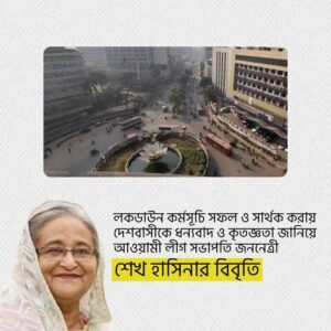 লকডাউন কর্মসূচি সফল ও সার্থক করায় দেশবাসীকে ধন্যবাদ ও কৃতজ্ঞতা জানিয়ে আওয়ামী লীগ সভাপতি জননেত্রী শেখ হাসিনার বিবৃতি