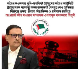 অবৈধ দখলদার খুনি-ফ্যাসিস্ট ইউনূসের অবৈধ আইসিটি ট্রাইব্যুনালে বঙ্গবন্ধু কন্যা জননেত্রী দেশরত্ন শেখ হাসিনার বিরুদ্ধে প্রদত্ত রায়ের তীব্র নিন্দা ও প্রতিবাদ