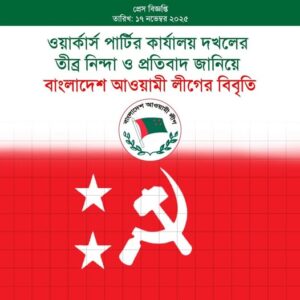 ওয়ার্কার্স পার্টির কার্যালয় দখলের তীব্র নিন্দা ও প্রতিবাদ জানিয়ে বাংলাদেশ আওয়ামী লীগের বিবৃতি