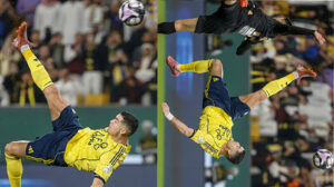 ফুটবলে বাইসাইকেল কিকে গোল করা নৈমিত্তিক ঘটনা নয়। তবে ৪০ পেরোনো ক্রিস্টিয়ানো রোনালদোর জন্য এটি কোনো সমস্যাই নয়। সৌদি প্রো লিগে আল খালেজের বিপক্ষে ম্যাচে রোনালদো আবারও সবাইকে বিস্মিত করেছেন। ম্যাচের যোগ করা সময়ের ৯৬ মিনিটে আল নাসর আক্রমণে উঠে ডান প্রান্তে বল পান নাওয়াফ বাওশাল। তিনি বক্সে থাকা রোনালদোর কাছে বল পাঠান। রোনালদো তখনই পিঠ মাটির দিকে রেখে বাইসাইকেল কিকের প্রস্তুতি নেন এবং অসাধারণ টাইমিংয়ে গোল করেন। খালেজের গোলরক্ষক আন্থনি মারেজ চেষ্টা করেও এই শট ঠেকাতে পারেননি। গোল করার পর রোনালদো সতীর্থদের সঙ্গে উদ্যাপন করেন। তিনি নিজেই সামাজিক মাধ্যমে এই গোলের ভিডিও পোস্ট করেন এবং ক্যাপশন নিজে না দিয়ে ভক্তদের ‘সেরা ক্যাপশন জয়ী হোক’ বলে চ্যালেঞ্জ দেন। ফ্যানরা বিভিন্ন সৃজনশীল ক্যাপশন দিয়ে অংশগ্রহণ করেন, যেমন ‘যে বাইসাইকেল কিক নিন্দুকদের অদৃশ্য করে দিয়েছে’, ‘আকাশে ভাসানো বলের গন্তব্য শুধুই জালের ভেতর’ ইত্যাদি। রোনালদোর এই গোলের রাতে আল নাসর সৌদি লিগে ৯ ম্যাচে নবম জয় নিশ্চিত করে। এই য়ের ফলে শীর্ষে থাকা আল নাসরের পয়েন্ট ২৭, সমান ম্যাচে দ্বিতীয় স্থানে থাকা আল হিলালের পয়েন্ট ২৩। পরবর্তী ম্যাচে আল নাসর এএফসি কাপে তাজিকিস্তানের ক্লাব ইস্টিকলোলের সঙ্গে মাঠে নামবে।