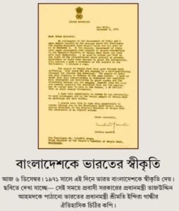 তাজউদ্দিনকে লেখা ভারতের প্রধানমন্ত্রী শ্রীমতি ইন্দিরা গান্ধীর সেই ঐতিহাসিক চিঠির কপি