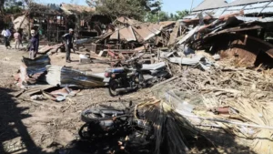 মিয়ানমারে একটি চায়ের দোকানে বিমান হামলা হয়েছে। এ ঘটনায় অন্তত ১৮ জন নিহত হয়েছেন। দেশটির স্থানীয় প্রশাসনিক কর্মকর্তা, এক উদ্ধারকর্মী এবং দুজন বাসিন্দা এএফপিকে এ তথ্য নিশ্চিত করেছেন। শনিবার (০৬ ডিসেম্বর) সাউথ চায়না মর্নিং পোস্টের এক প্রতিবেদনে এ তথ্য জানানো হয়েছে। স্থানীয় প্রশাসন জানিয়েছে, শুক্রবার সন্ধ্যায় সাগাইং অঞ্চলের তাবাইং টাউনশিপে দুটি বোমা হামলা চালানো হয়েছে। এর একটি ব্যস্ত চায়ের দোকানে সরাসরি আঘাত হেনেছে। এতে ১৮ জন নিহত ও ২০ জন আহত হয়েছেন। উদ্ধারকর্মীরা জানান, হামলার ১৫ মিনিটের মাথায় তারা ঘটনাস্থলে পৌঁছান। সাতজন ঘটনাস্থলেই নিহত হন, বাকিরা হাসপাতালে নেওয়ার পর মৃত্যুবরণ করেন। হামলায় চায়ের দোকানটি ও আশপাশের প্রায় ডজনখানেক বাড়ি পুরোপুরি ধ্বংস হয়ে গেছে। একজন জীবিত বেঁচে যাওয়া ব্যক্তি বলেন, তিনি তখন দোকানে বসে টেলিভিশনে বক্সিং ম্যাচ দেখছিলেন। বিমানের শব্দ শুনে মাটিতে লুটিয়ে পড়ায় তিনি প্রাণে বেঁচে যান। বিস্ফোরণের শব্দ ছিল অসহনীয় জোরে। মাথার ওপর বিশাল আগুনের গোলা দেখেছিলাম। হামলা নিয়ে জান্তার কোনো কর্মকর্তা এএফপির ফোনকলের জবাব দেননি। প্রতিবেদনে বলা হয়েছে, শনিবার নিহতদের জানাজা ও শেষকৃত্য সম্পন্ন হয়। স্থানীয়রা জানান, বিস্ফোরণে অনেকের মুখমণ্ডল চিনতে না পারায় তোয়ালে দিয়ে ঢেকে রাখা হয়। এর আগে, গত মে মাসে সাগাইং অঞ্চলে জান্তার আরেক বিমান হামলায় ২২ জন নিহত হয়েছিলেন। তাদের মধ্যে ২০ জন শিশু ছিলেন।